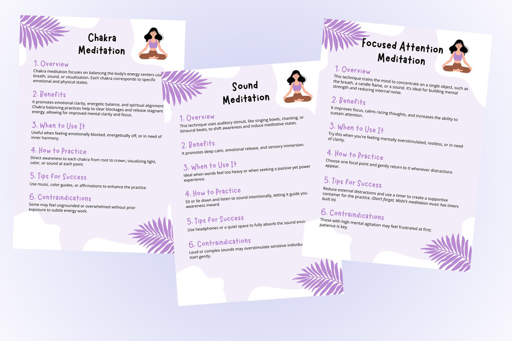 Super simple, quick sheets to unlock the essentials of each meditation practice. Whether you're a complete beginner or a wellness professional looking for simple teaching aids, this quick guide breaks down complex practices into digestible, easy-to-follow summaries.